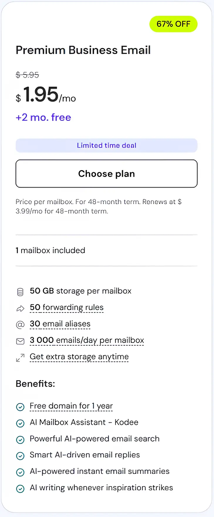| Premium Business Email Deal:5 mailboxes (pay for 4), 50โฏGB storage, 50 forwarding rules, 30 aliases, 3,000 emails/day, free domain, AI features โ | Higher total cost, may be overkill for very small teams โ |
