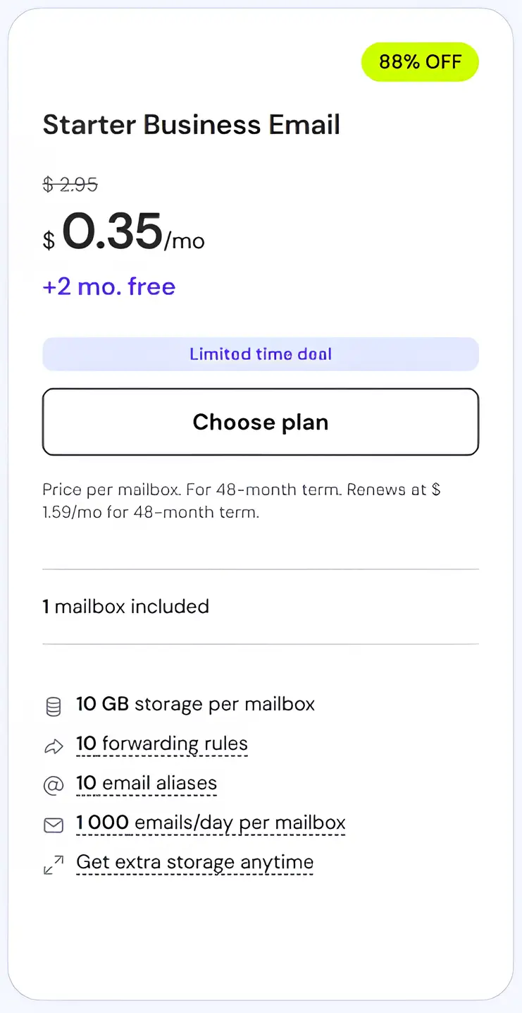 | Starter Business Email:1 mailbox, 10โฏGB storage, 10 forwarding rules, 10 aliases, 1,000 emails/day, low cost, easy to use โ | Limited storage, fewer forwarding rules/aliases, no AI features, only 1 mailbox โ |