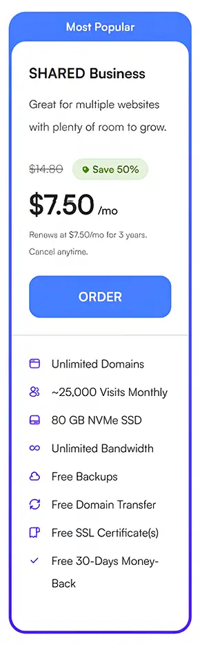 Shared Business is best for growing websites or small eCommerce stores. With unlimited domains, about 80 GB NVMe SSD storage, and unlimited bandwidth, it’s strong enough for more traffic (up to ~25,000 visits monthly) while keeping your site fast and backed up.