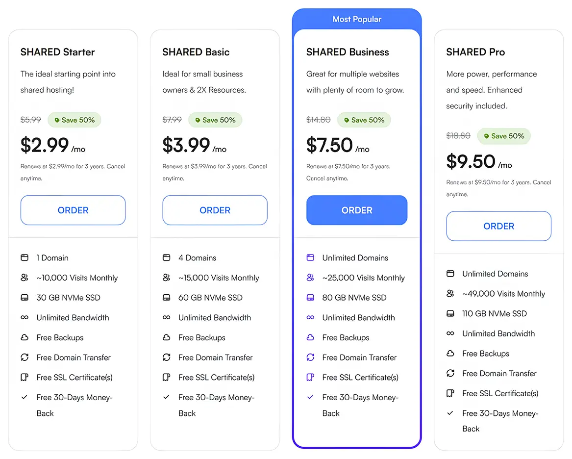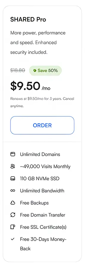 Shared Pro offers more power and performance for websites with higher traffic or heavier content. It includes unlimited domains, ~110 GB NVMe SSD, unlimited bandwidth, and all the essential features — making it a good choice for larger sites that need extra reliability and speed.