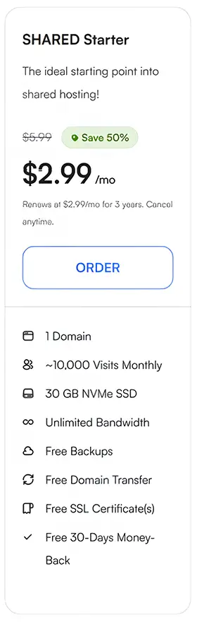 Shared Starter is ideal for small websites, personal blogs, or simple projects. It includes 1 domain, about 30 GB NVMe SSD storage, unlimited bandwidth, free daily backups, and a free SSL certificate — enough for around 10,000 monthly visits and perfect for beginners just getting online.